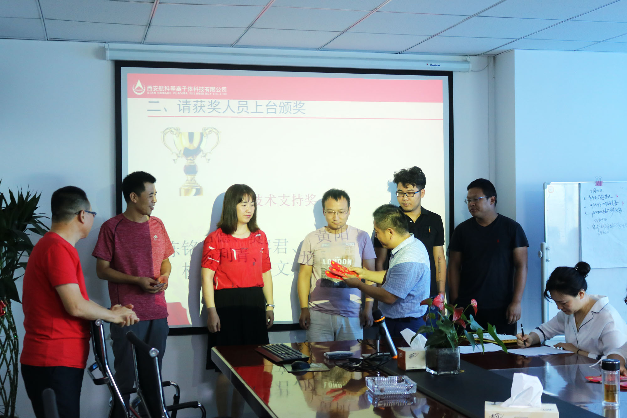 總工程師兼副總經(jīng)理馬俊與楊副總對獲獎員工進行頒獎。